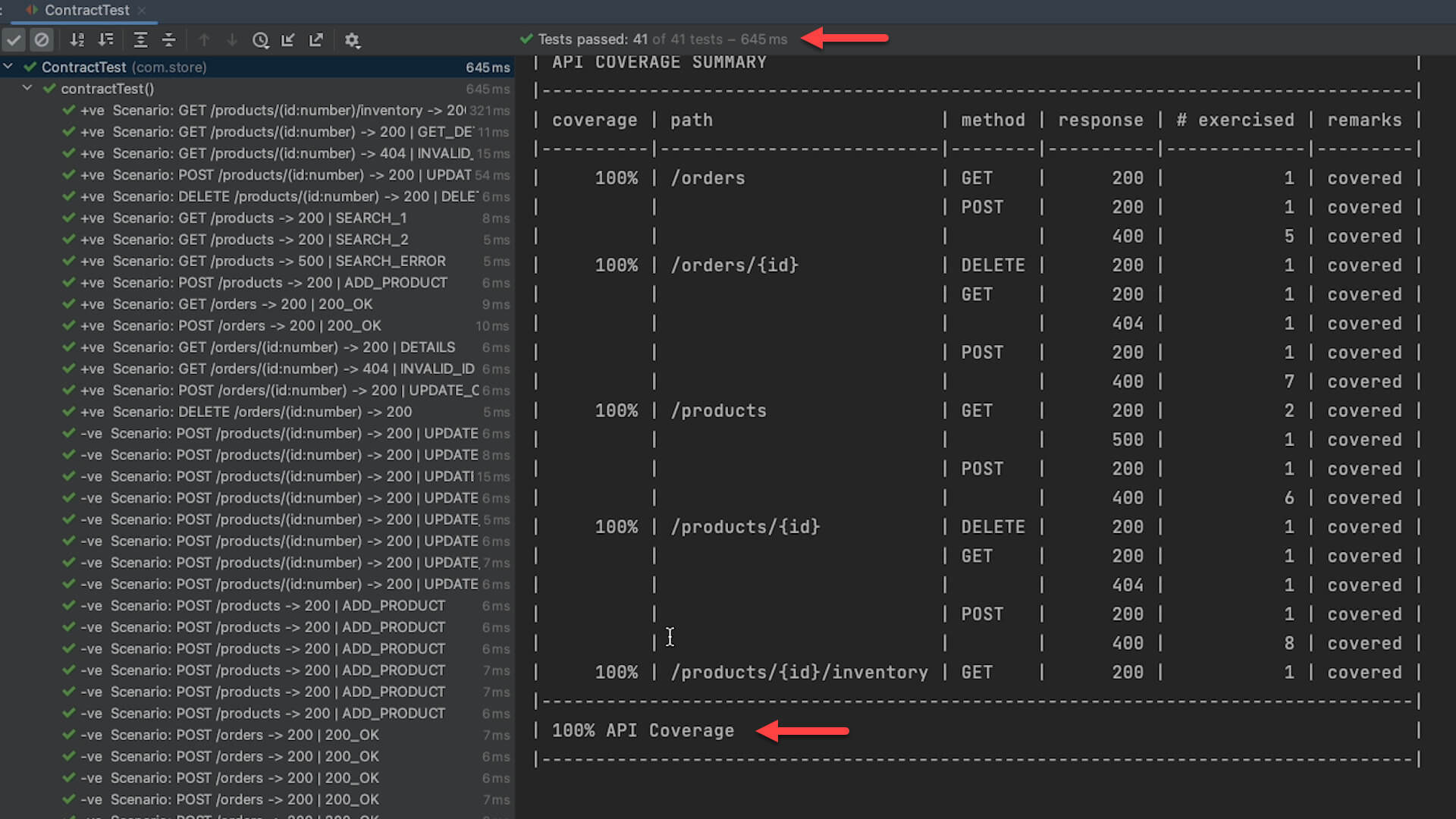 Running the test again you’ll see all tests are passing. The API coverage is 100% and there are no missing endpoints in the specification. The success criteria of the API coverage report have been met, and the build passes as well.