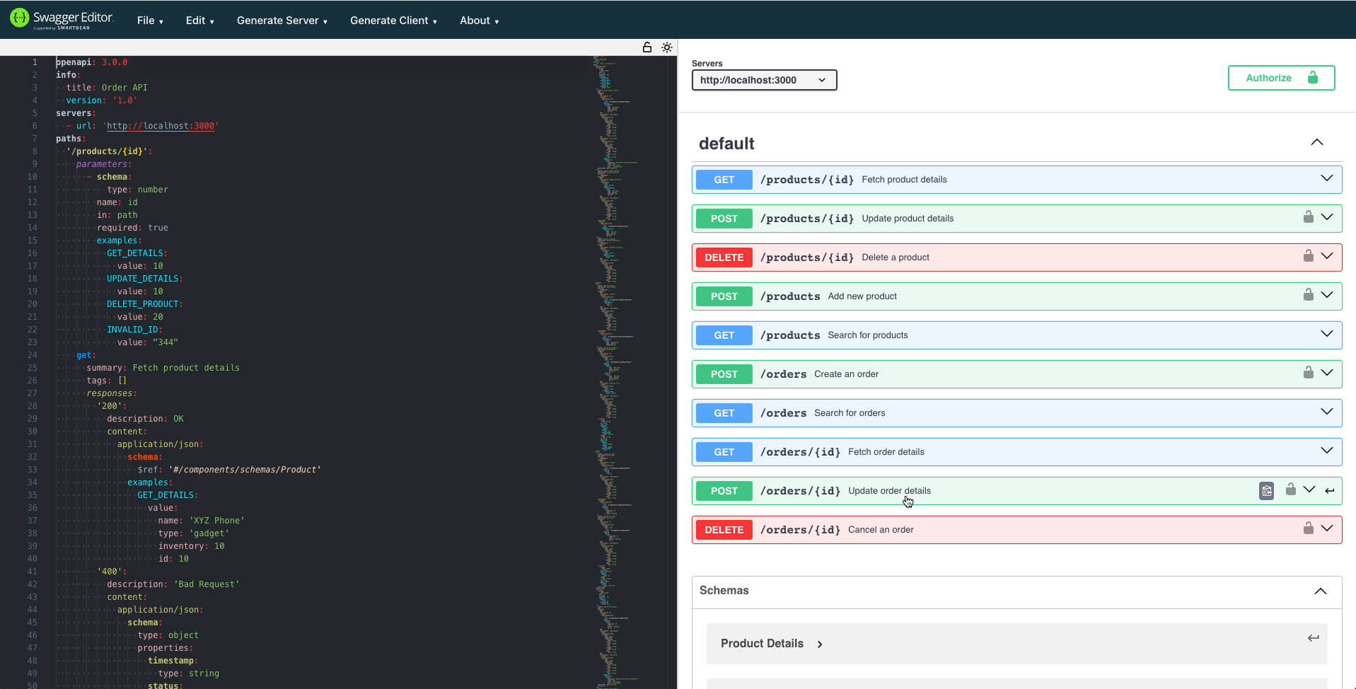 - The GET method of the products/{id} endpoint is also missing in the spec.