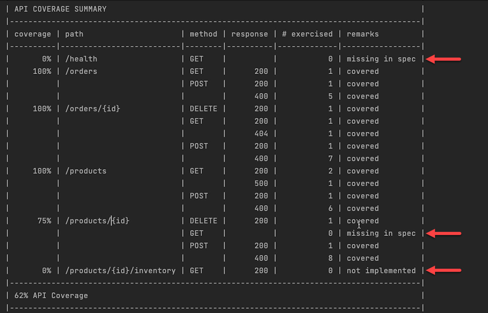 The API coverage report lists all the endpoints with their methods and response codes. For every endpoint, it reports the coverage and also indicates if the endpoint is missing in the spec or not implemented in the application. It also reports how many times a particular endpoint was called during the test execution. There are three main issues identified in this example.