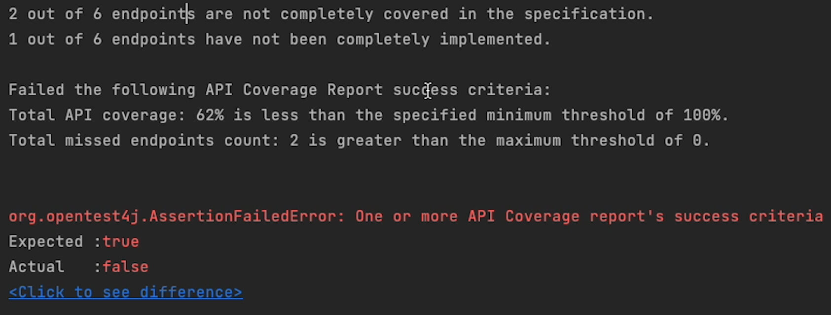 Below this, you can see that the success criteria for the API coverage report has not been met.