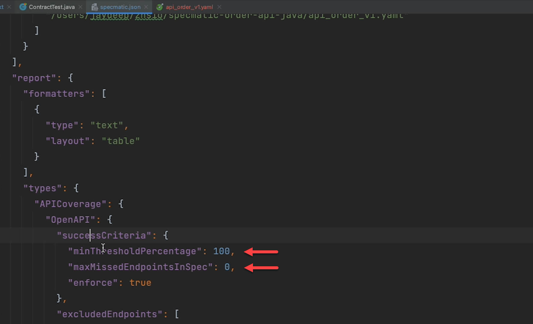 Let’s dig into this further. The success criteria for the API coverage report is defined in the report configuration section of the specmatic.json file.