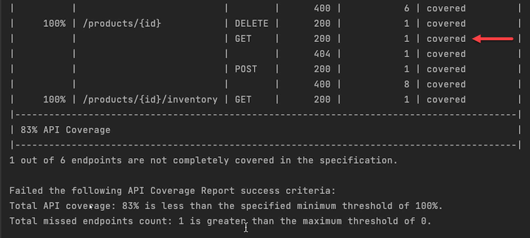 The build fails again because the success criteria still hasn’t been met. The API coverage now is 83%, less than the threshold of 100%, and there is still one missing endpoint in the specification, and that’s the health endpoint.