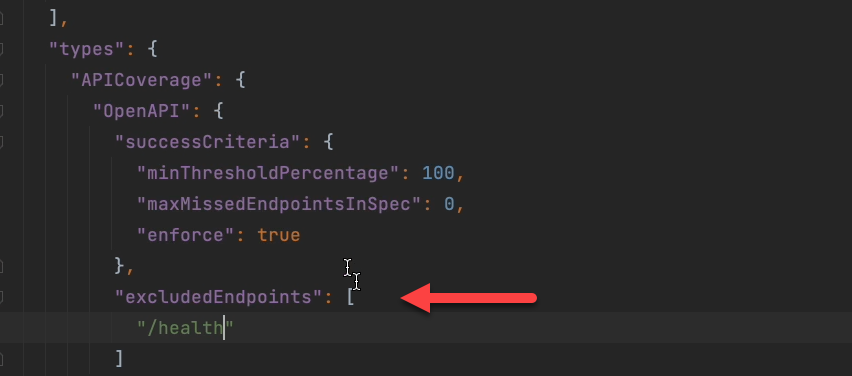 It’s possible you want to exclude certain monitoring endpoints like health and heartbeat from the coverage report. This can be done in the report configuration section of Specmatic’s config file by adding the URL in the excluded endpoints array.